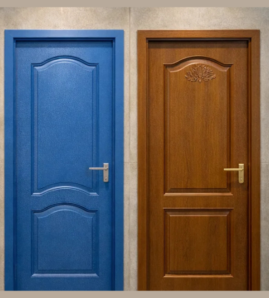 Yes. Veneer flush doors use a real wood veneer surface bonded over an engineered core, offering genuine wood appearance with better stability.